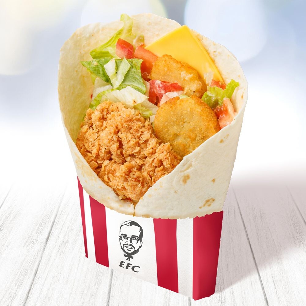 Пшеничная тортилья, сырный соус, помидор, айсберг, сыр чеддер, куриное филе в панировке