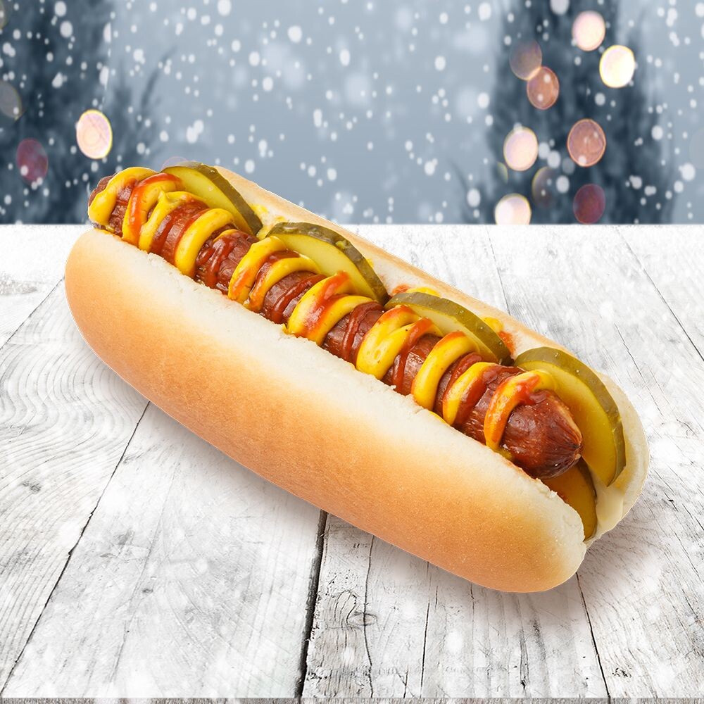 Булка хот дог, соус кимчи, маринованные огурцы, куриная сосиска, жареный лук.