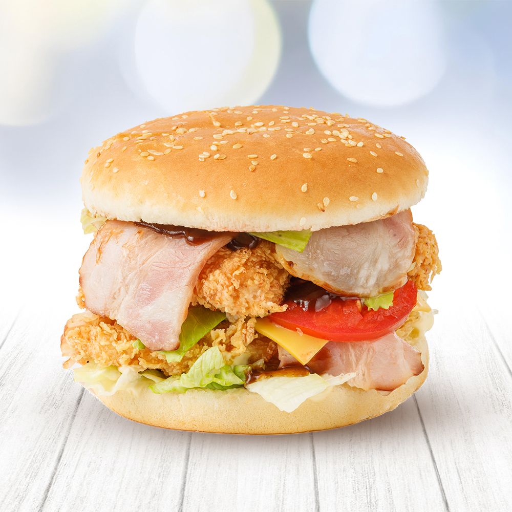 Булочка с кунжутом, соус макси бургер, соус сырный, помидор, айсберг, сыр чеддер, бекон