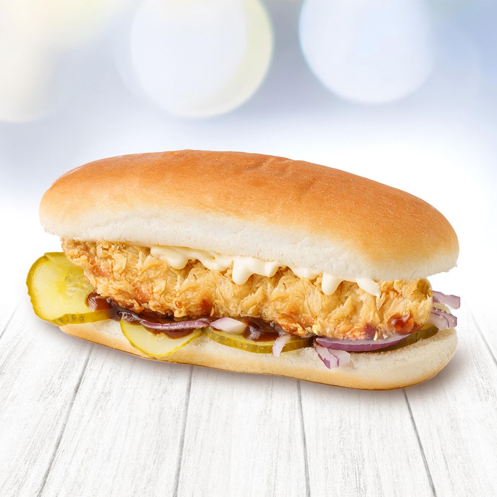 Булочка хот дог, майонез, соус барбекю, лук, маринованные огурцы, куриное филе в панировке.