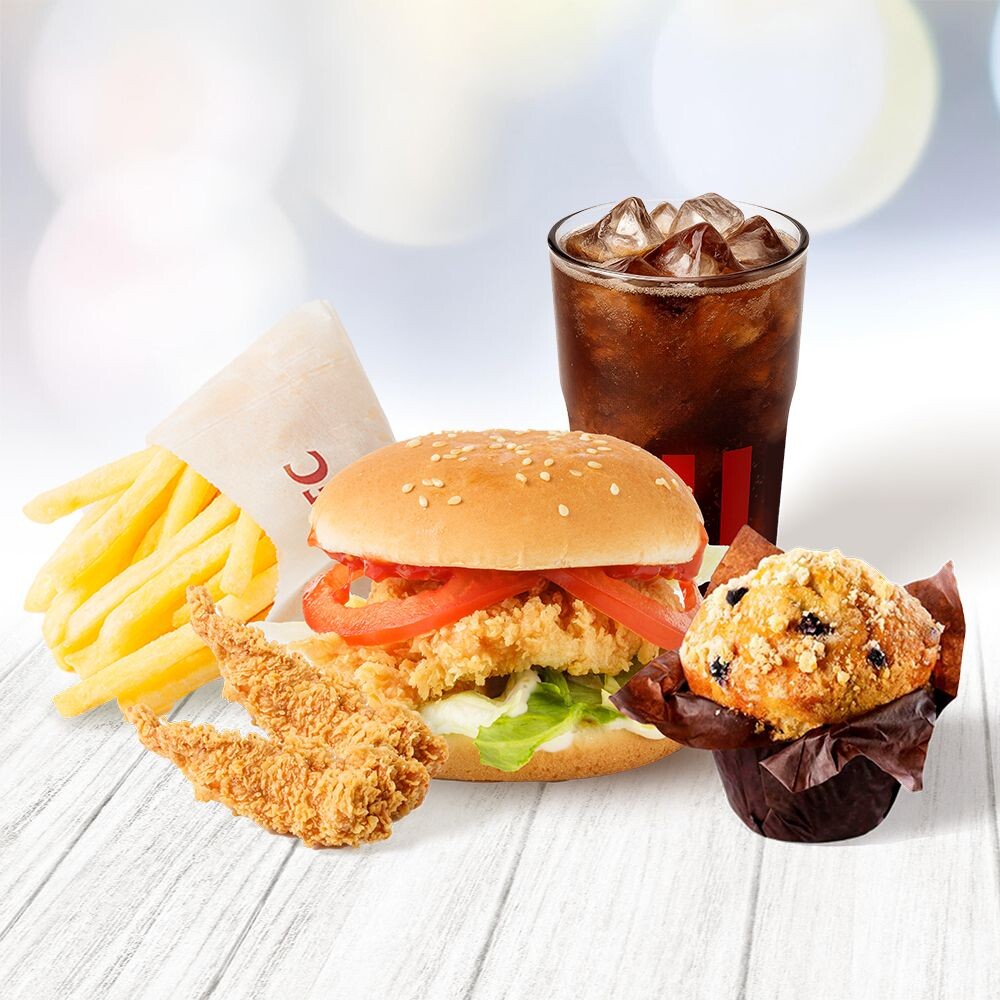 2 стрипсы, карт.фри 60г, маффин, нью классик бургер, напииток 0,3 на выбор