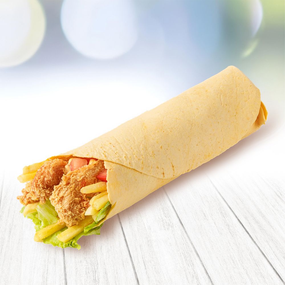 Сырная тортилья, соус сырный, картофель фри, маринованые огурцы, помидоры, айсберг, стрипсы