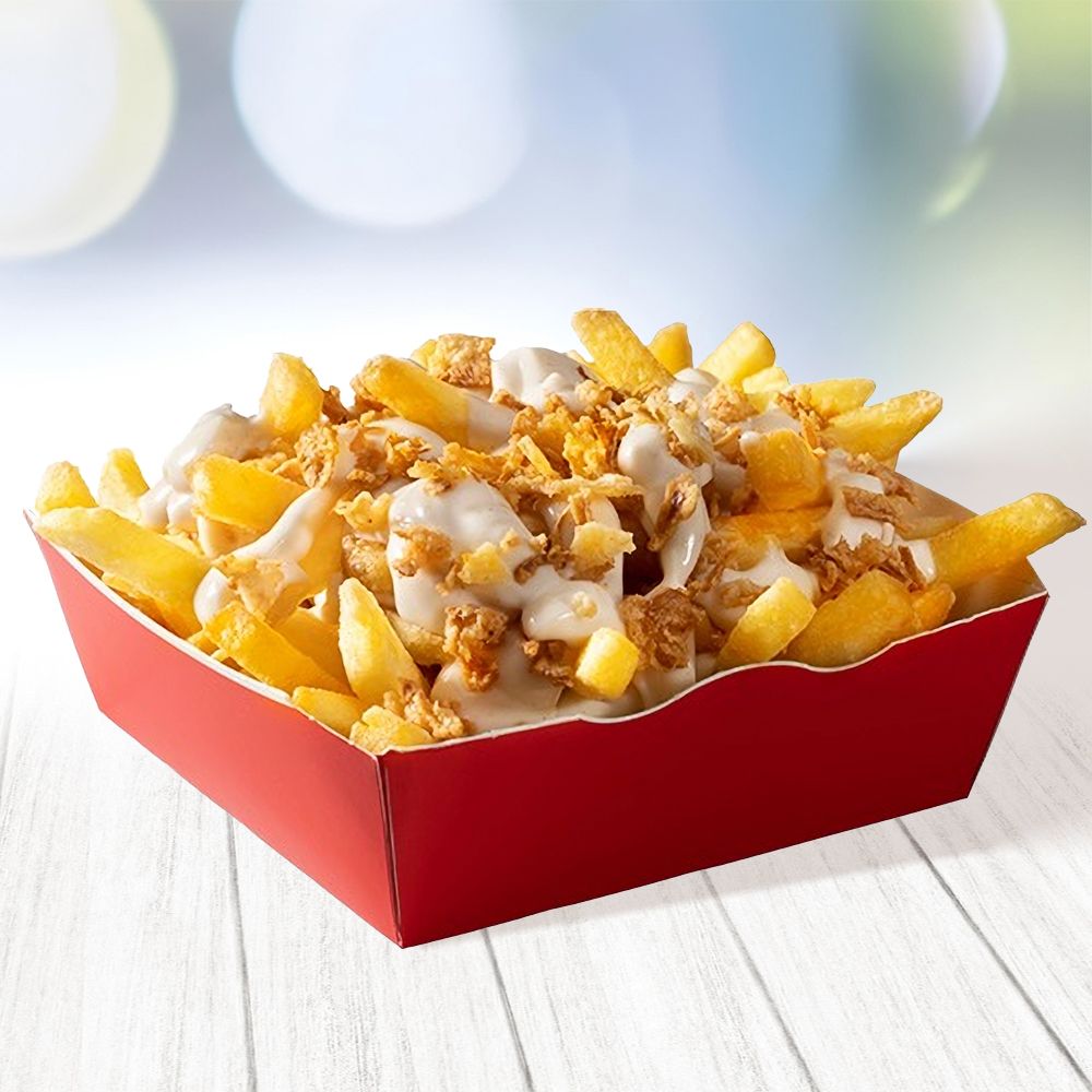 100 гр карт.фри, политая сырным соусом, посыпанная хрустящим жаренным луком